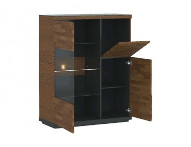 Мебель для гостинной, столовой и спальни радуют легкостью формы и сдержанной элегантностью, создавая гармоничный интерьер. Фронты блоков выполнены из массива дуба. Мебель доступна цветах: античный орех в сочетании с черным. Современные решения, такие как системы открытия нажатием push to open, позволяют тихо открывать ящики и дверцы, что является отличным решением для спальни, а подсветка стеклянных полок, подчеркивают функциональные качества этойт коллекции.