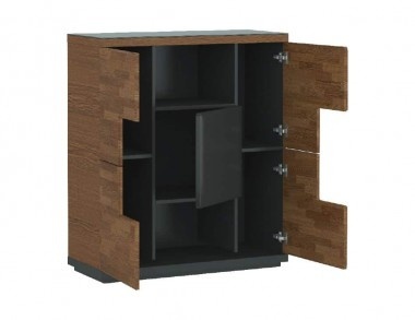 Мебель для гостинной, столовой и спальни радуют легкостью формы и сдержанной элегантностью, создавая гармоничный интерьер. Фронты блоков выполнены из массива дуба. Мебель доступна цветах: античный орех в сочетании с черным. Современные решения, такие как системы открытия нажатием push to open, позволяют тихо открывать ящики и дверцы, что является отличным решением для спальни, а подсветка стеклянных полок, подчеркивают функциональные качества этойт коллекции.