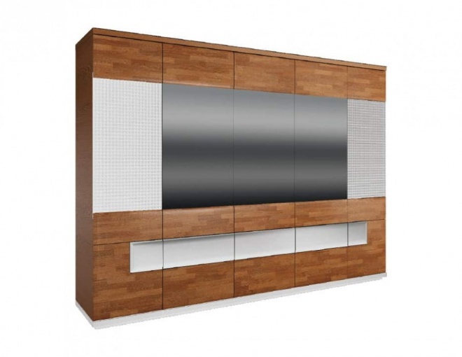 Мебель для гостинной, столовой и спальни радуют легкостью формы и сдержанной элегантностью, создавая гармоничный интерьер. Фронты блоков выполнены из массива дуба. Мебель доступна цветах: античный орех в сочетании с черным. Современные решения, такие как системы открытия нажатием push to open, позволяют тихо открывать ящики и дверцы, что является отличным решением для спальни, а подсветка стеклянных полок, подчеркивают функциональные качества этойт коллекции.