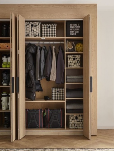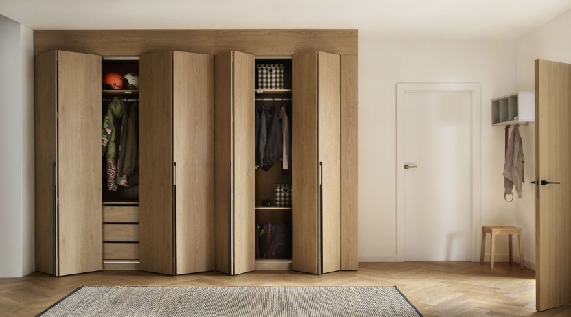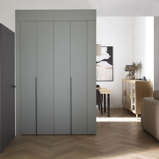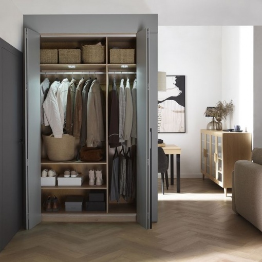 Шкаф-купе Stor с удобными складными дверцами и подсветкой внутри поможет вам организовать гардероб в соответствии с вашими потребностями. Вы можете выбрать свой вариант оборудования из 3 доступных пакетов. Добавив боковой шкаф, вы получите еще больше места для своих вещей. В сочетании со шкафом другой ширины и маскирующими панелями получится просторная, изготовленная по индивидуальному заказу конструкция, доступная немедленно. Идеально подходит для любого интерьера — от прихожей, гардеробной и спальни до детской комнаты.