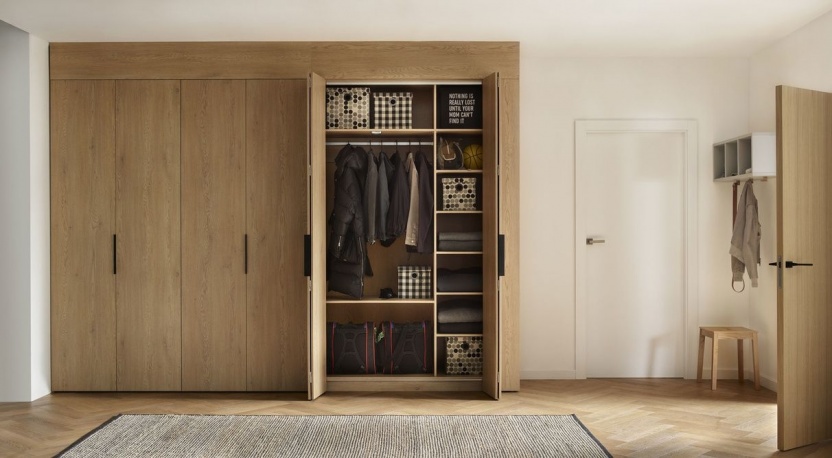 Гениальные решения — это наша стихия. Если у вас нет технического помещения, то дополнительный боковой шкаф с зеркалом решит ваши проблемы — в нем легко разместится, например, гладильная доска. Оснащенный полками и вешалками, он также может хранить ремни, сумки и шарфы.