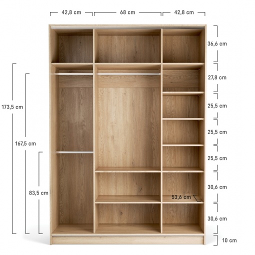 • Шкаф высотой 240 см в комплектации Maxi имеет 2 фиксированные полки, расположенные в боковых сегментах. В левой части также имеется штанга для вешалок и выдвижная вешалка для брюк, а в правой части — 5 регулируемых полок, которые можно отрегулировать в зависимости от количества хранимых вещей. В средней части шкафа расположена опускаемая штанга (пантограф), облегчающая доступ к подвешенным сверху вещам, и контейнеры с 3 ящиками.