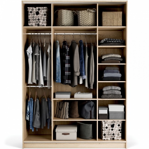 Корпус шкафа цвета дуба можно комбинировать с фасадами одного из пяти оттенков на выбор. Окончательный облик вы можете создать, выбрав один из шести вариантов ручек. Вы можете добиться еще большего количества цветовых комбинаций, добавив накладки на боковины шкафа в цветовой палитре, соответствующей фасадам. Удобные двери! Все шкафы имеют высококачественные раздвижные двери-складыши, оснащенные надежной, современной системой WingLine от Hettich. При открытии шкафа такого типа дверь обеспечивает полный доступ к его внутреннему пространству и экономит много места.