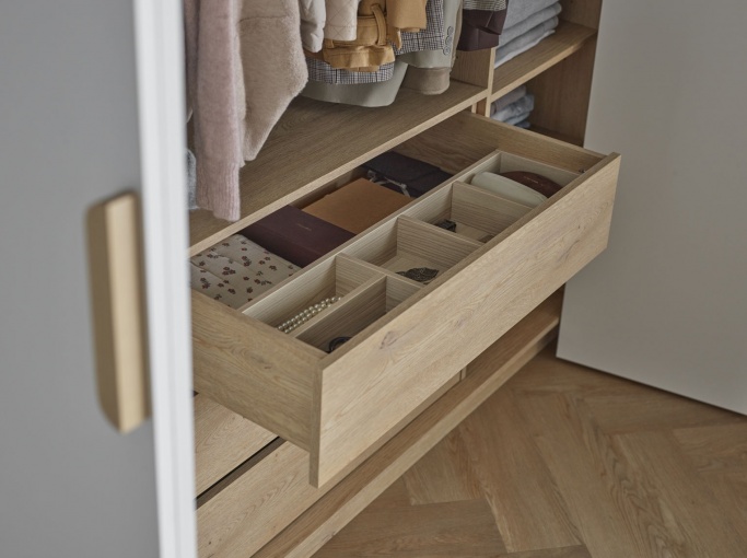 • Раздвижные двери легко раздвигаются одним движением. Они обеспечивают свободный доступ ко всему содержимому гардероба. Они складываются гармошкой, поэтому не занимают много места. Система плавного закрывания установлена в элегантно скрытых петлях.